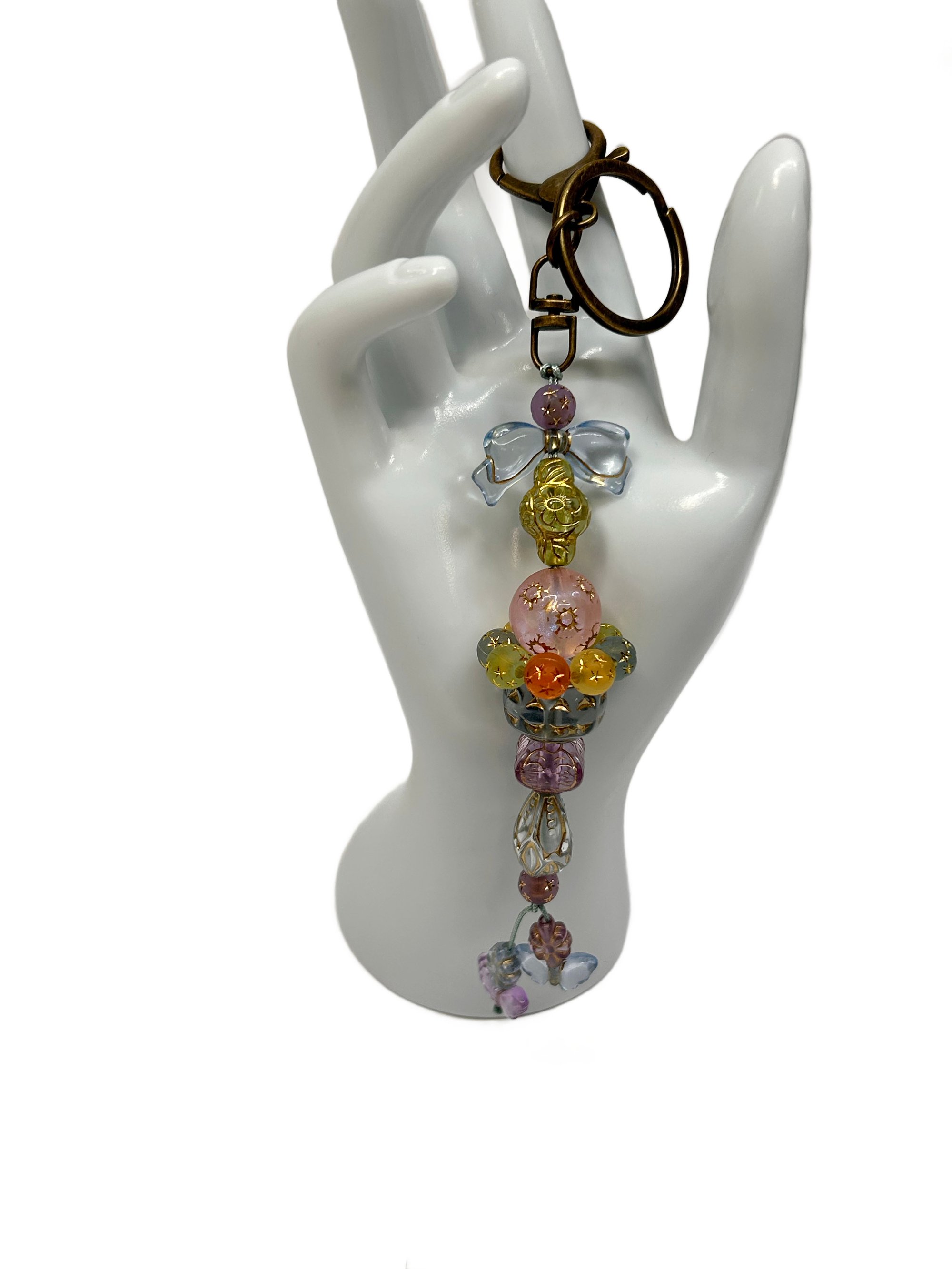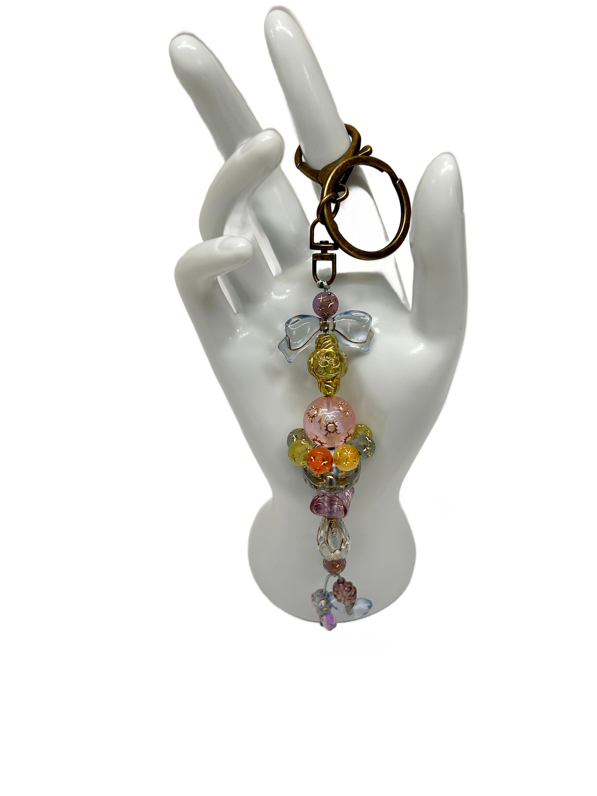 1 PC. ANTIQUE BRONZE/GOLD TONE ACCENTED PASTEL BEADED ACRYLIC/RESIN HAND MADE KEY RING /PURSE SWAG