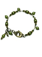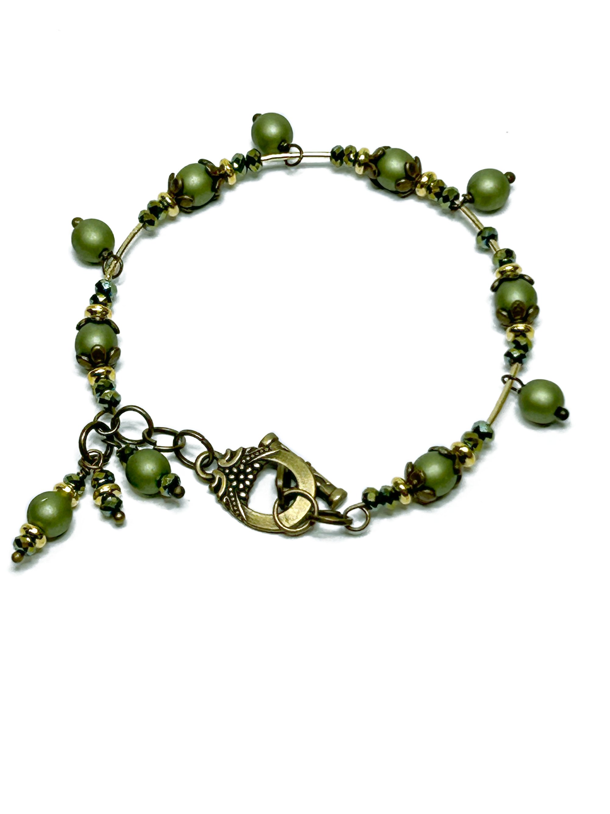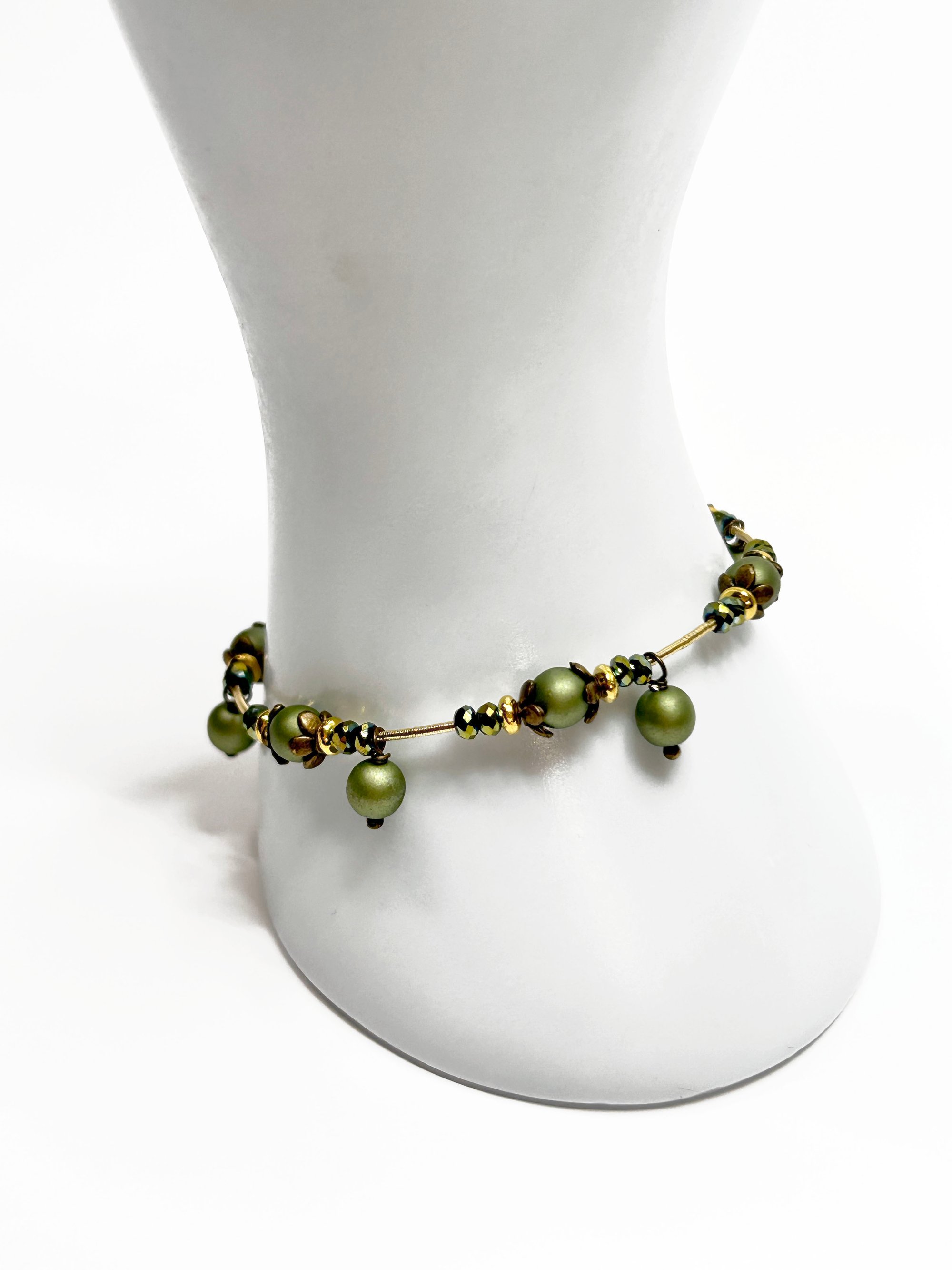 IPC. HAND MADE OLIVE/METALLIC GREEN FIRE POLISHED GLASS BEAD MEMORY WIRE BRACELET WITH ANTIQUE BRONZE TOGGLE CLASP CLOSURE.