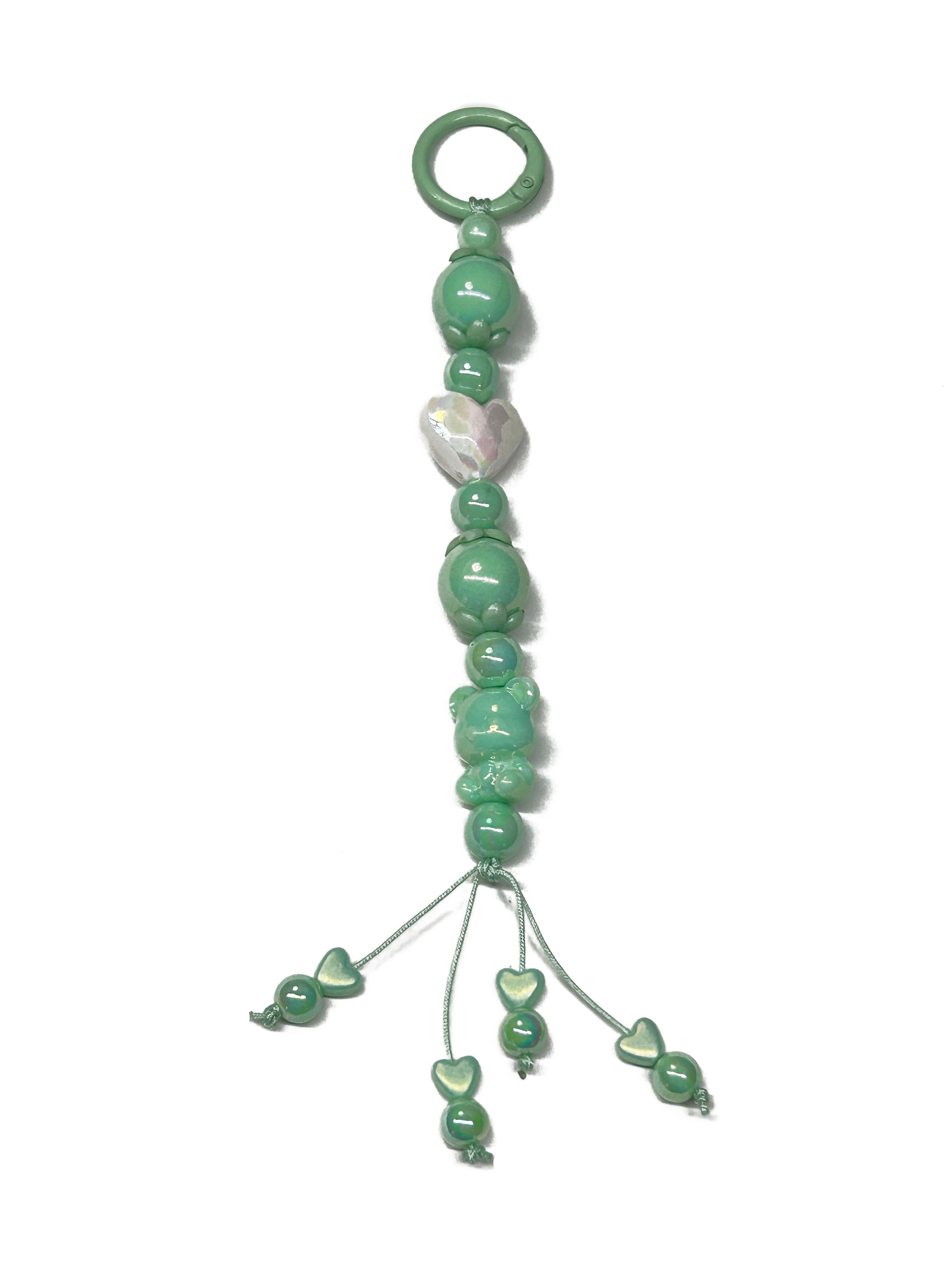 1PC. WHITE HEART/GREEN BEAR ACRYLIC/RESIN HAND MADE KEY RING LANYARD/PURSE SWAG/CELL SWAG